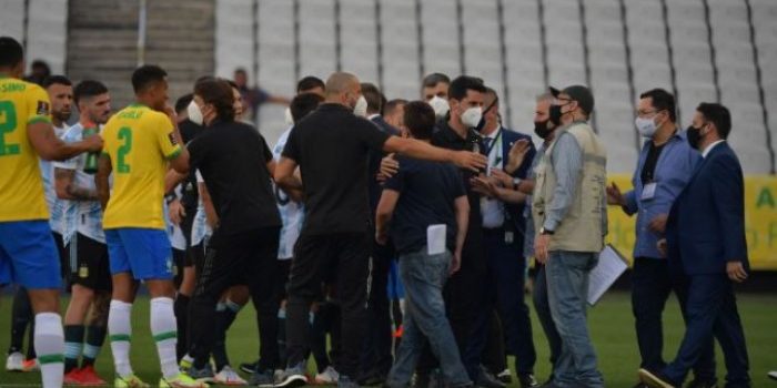 Խաղը դադարեցվեց մեկնարկից 4 րոպե անց՝ մարզադաշտում Բրազիլիայի առողջության վերահսկման ազգային գործակալության և ոստիկանության ներկայության պատճառով: Նրանք կասկածում են, որ արգենտինացի ֆուտբոլիստներ Էմիլիանո Մարտինեսը, Էմիլիանո Բուենդիան, Ջովանի Լո Սելսոն և Քրիստիան Ռոմերոն խախտել են սահմանը: