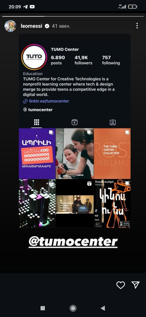 Արգենտիացի հարձակվող, աշխարհի չեմպիոն Լիոնել Մեսսին Instagram-ի իր հաշվում կիսվել է հայկական Թումո կենտրոնի ինստագրամյան էջով։