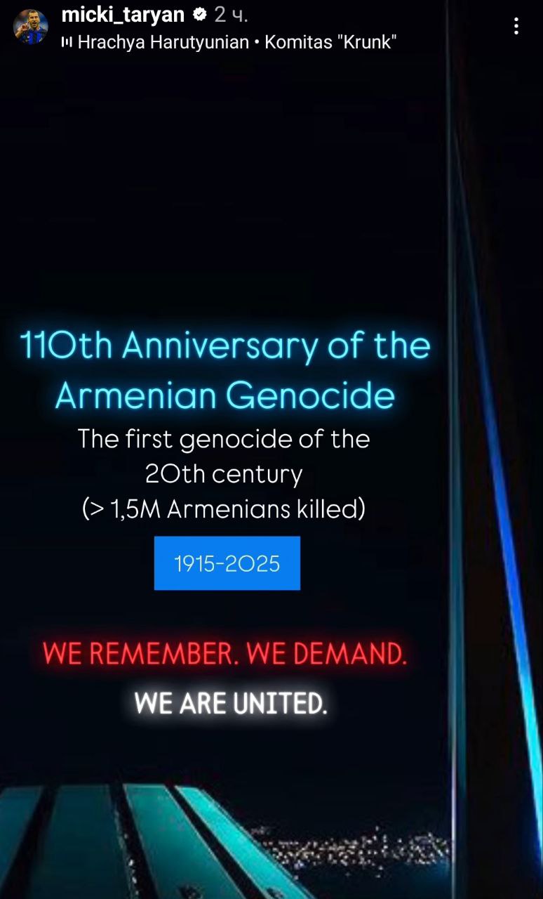 Հայաստանի ազգային հավաքականի նախկին ավագ, իտալական «Ինտերի» կիսապաշտպան Հենրիխ Մխիթարյանը, սոցիալական ցանցերի իր էջում հրապարակում է կատարել Հայոց ցեղասպանության 110-րդ տարելիցի վերաբերյալ։