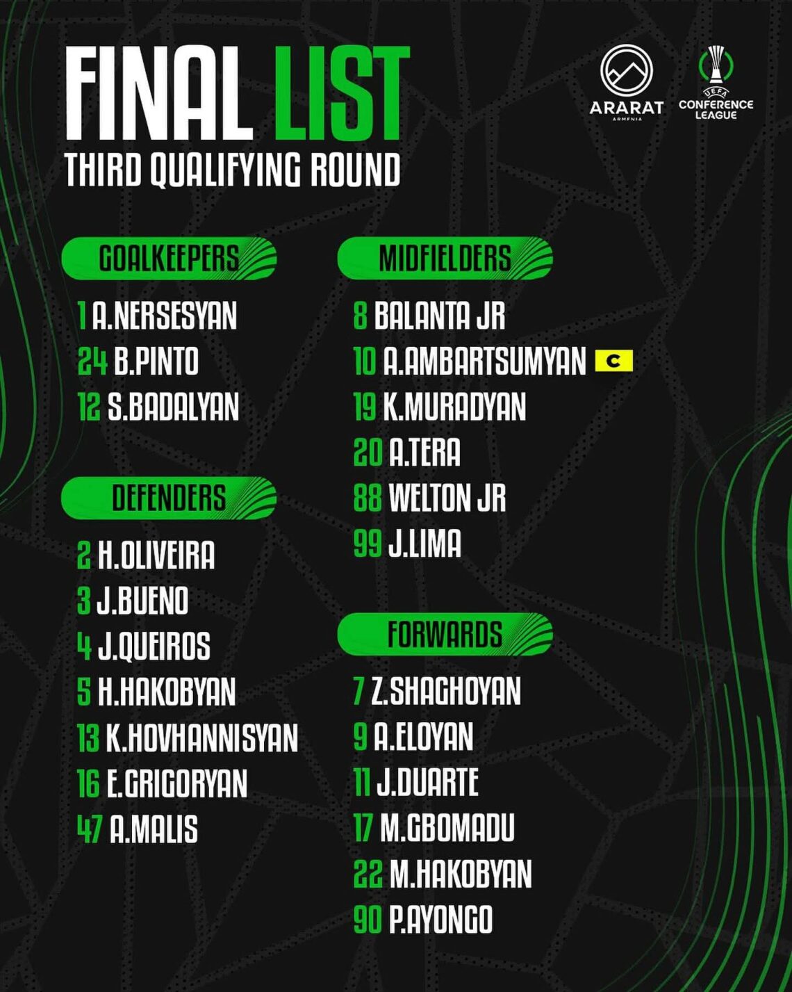 Երևանյան ակումբը հրապարակել է թիմի հայտացուցակը առաջիկա երկու հանդիպումների համար։