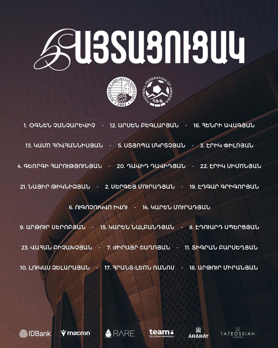 Հայտնի է Հայաստանի ազգային հավաքականի վերջնական հայտացուցակը Հունգարիայի հավաքականի դեմ ԱԱ-2026-ի եվրոպական գոտու ընտրական մրցաշարի F խմբի հանդիպման համար: