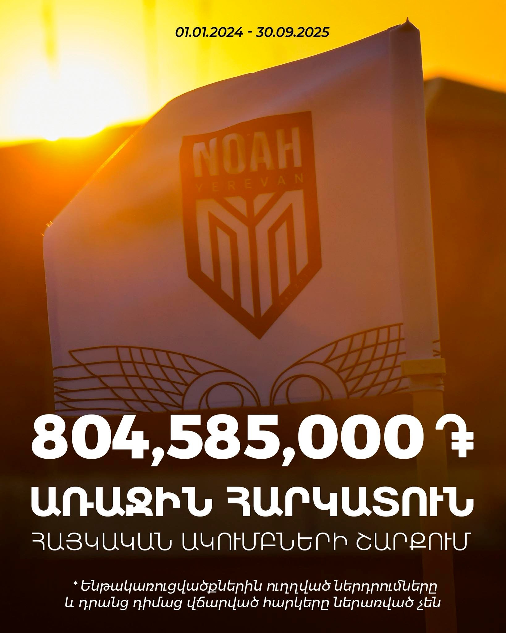 «2024թ․ հունվարի 1-ից մինչև 2025թ․ սեպտեմբերի 30-ը մեր ակումբը պետական բյուջե է վճարել 804,585,000 ՀՀ դրամ՝ դառնալով Հայաստանի ֆուտբոլային ակումբների շարքում ամենամեծ հարկատուն։ Այս ցուցանիշը ևս մեկ անգամ վկայում է, որ մեր բոլորի համատեղ ջանքերով ֆուտբոլի զարգացումը կբերի էլ ավելի ու ավելի մեծ տնտեսական արդյունք